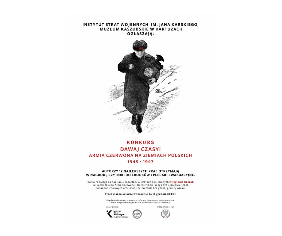 Instytut Strat Wojennych im. Jana Karskiego w Warszawie, we współpracy z Muzeum Kaszubskim, ogłasza ogólnopolski konkurs edukacyjno-historyczny „Dawaj czasy! Armia Czerwona na ziemiach polskich 1945–1947”. Konkurs ma na celu zachęcenie uczestników do opracowania pisemnych prac dokumentujących rzeczywiste straty poniesione przez ich rodziny lub najbliższe otoczenie na skutek działalności Armii Czerwonej, z uwzględnieniem regionu Kaszub.