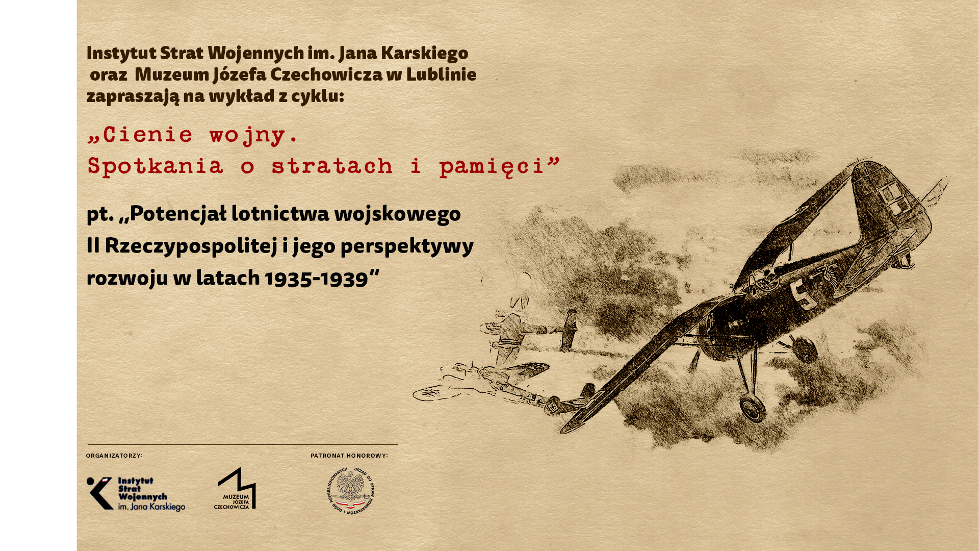 Wykład historyczno-edukacyjny pt. „Potencjał polskiego lotnictwa wojskowego II Rzeczypospolitej i jego perspektywy rozwoju w latach 1935-1939”. Było to kolejne wydarzenie z cyklu „Cienie wojny. Spotkania o stratach i pamięci”, organizowanego przez Instytut Strat Wojennych.