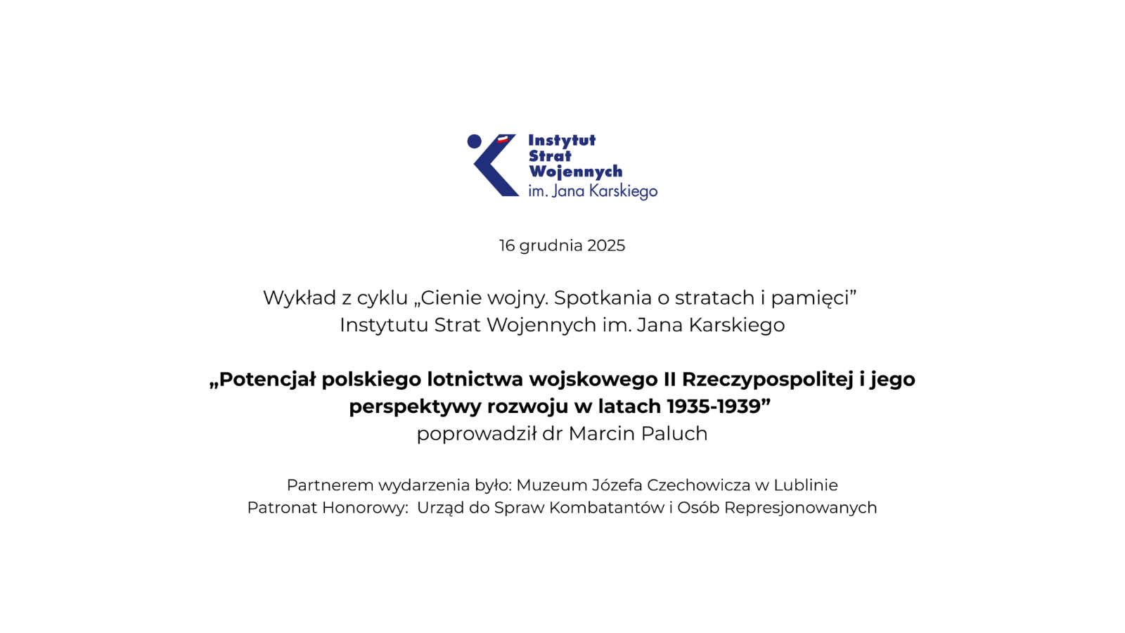 Wykład historyczno-edukacyjny pt. „Potencjał polskiego lotnictwa wojskowego II Rzeczypospolitej i jego perspektywy rozwoju w latach 1935-1939”. Było to kolejne wydarzenie z cyklu „Cienie wojny. Spotkania o stratach i pamięci”, organizowanego przez Instytut Strat Wojennych.